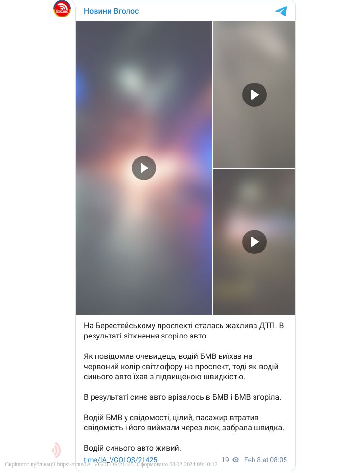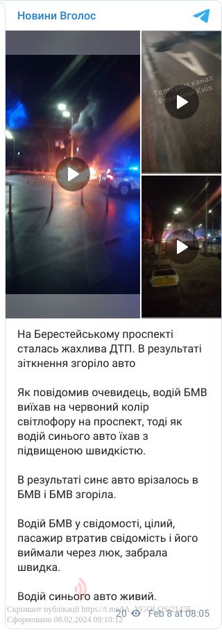За попередньою інформацією, водій BMW порушив правила дорожнього руху та виїхав на червоний колір світлофору на Берестейський проспект. Керманич синього авто їхав із перевищеною швидкістю. Унаслідок цього другий транспортний засіб врізався у перший. Згідно з фото та відео з місця події, через аварію BMW згоріла.
