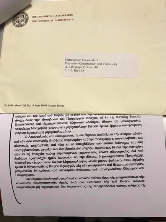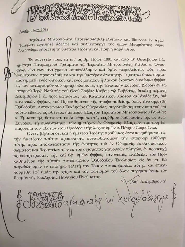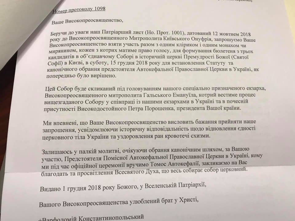 «Беручи до уваги наш Патріарший лист (Но. Прот. 1001), датований 12 жовтнем 2018 року до Високопреосвященного Митрополита Київського Онуфрія, запрошуємо Ваше Високопреосвященство взяти участь разом з одним кліриком і одним монахом чи мирянином, кожен з котрих матиме право голосу для формування бюлетеня з трьох кандидатів в Об’єднавчому Соборі в історичній церкві Премудрості Божої (Святої Софії) в Києві в суботу, 15 грудня 2018 року, для встановлення Статуту та канонічного обрання Предстоятеля Автокефальної Православної Церкви в Україні, як попередньо було вирішено», - йдеться в документі.