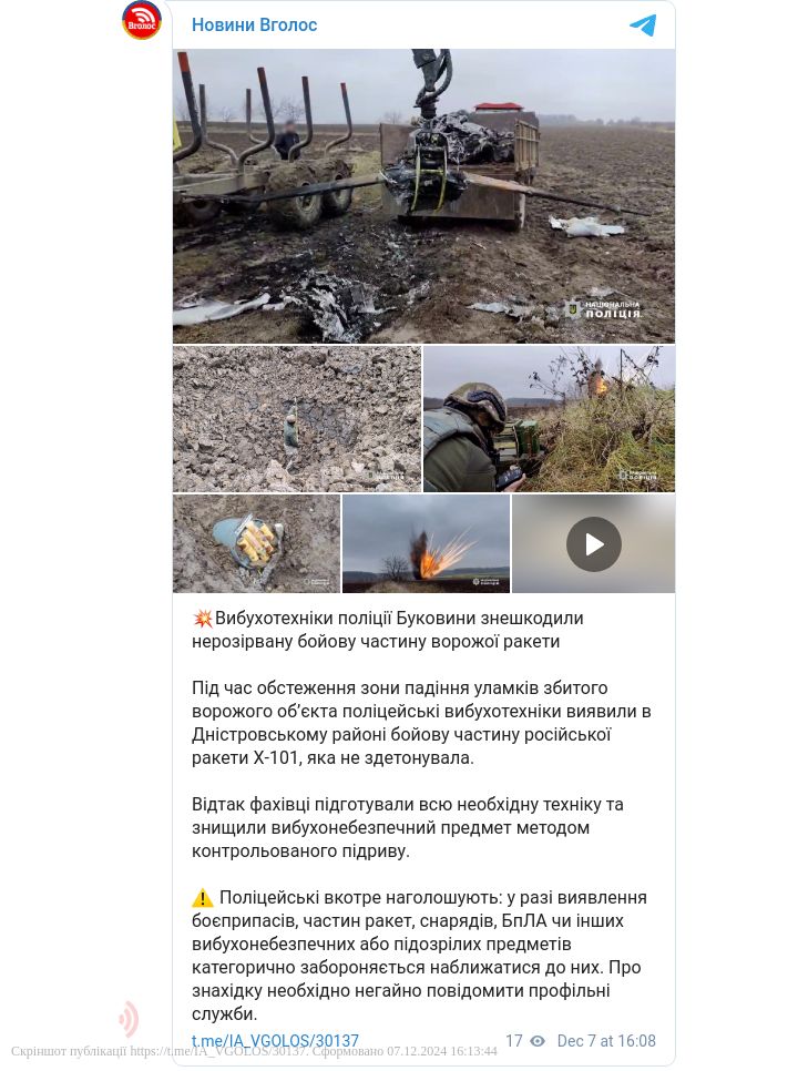 Вибухотехніки поліції Буковини знешкодили нерозірвану бойову частину ворожої ракети.