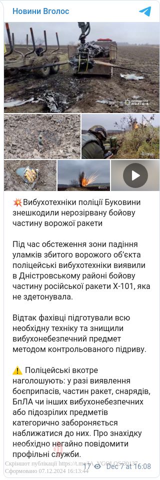Під час обстеження зони падіння уламків збитого ворожого об’єкта поліцейські вибухотехніки виявили в Дністровському районі бойову частину російської ракети Х-101, яка не здетонувала.