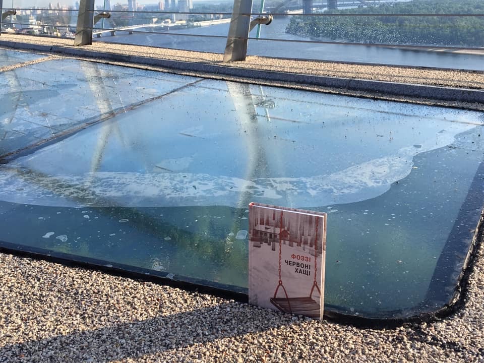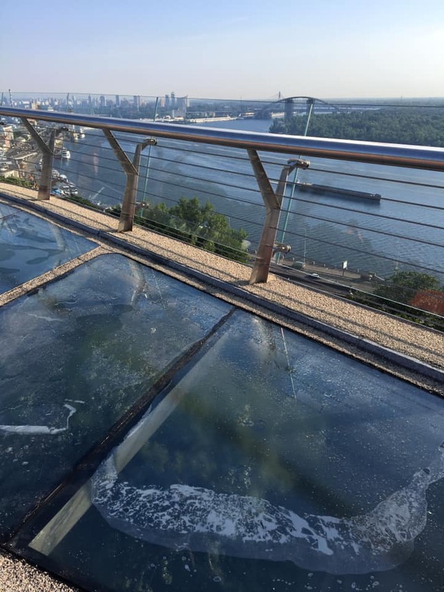 «Під усім склом вода і химерні грязьові «розводи» між шарами. І не дивно, бо між покриттям мосту й склом є зазор сантиметрів півтора-два (в один із них для наочності встромлено творіння Фоззі)», – уточнив автор поста.