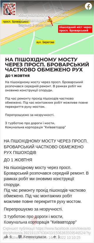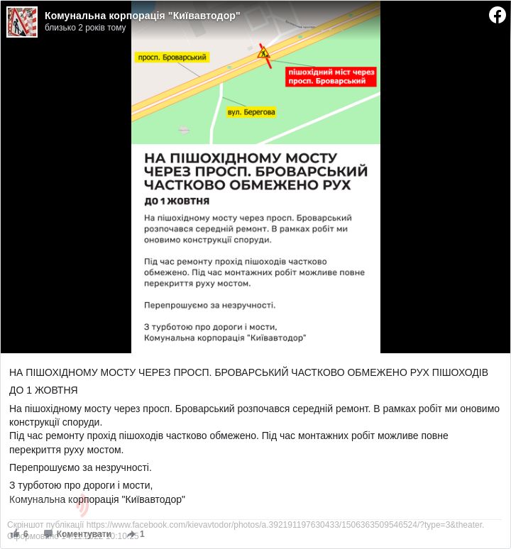 На пішохідному мосту через Броварський проспект до 1 жовтня частково обмежено рух.