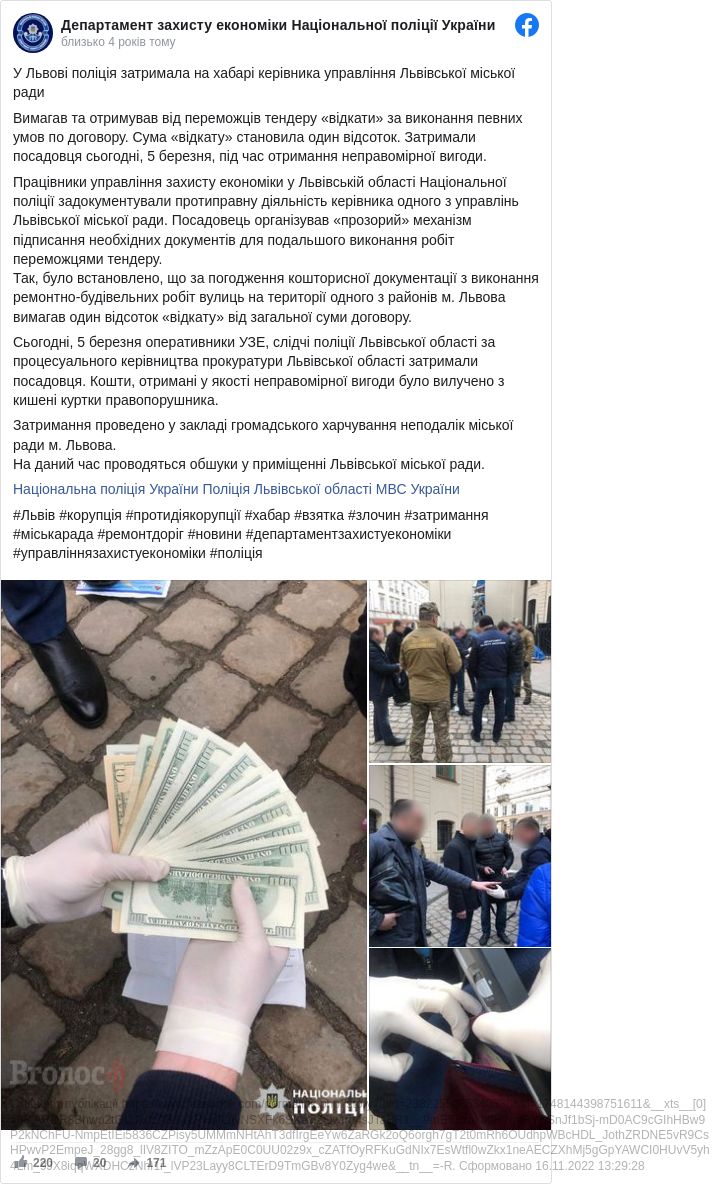 "Посадовець організував "прозорий" механізм підписання необхідних документів для подальшого виконання робіт переможцями тендеру. Так, було встановлено, що за погодження кошторисної документації з виконання ремонтно-будівельних робіт вулиць на території одного з районів м. Львова вимагав один відсоток "відкату" від загальної суми договору", – йдеться у повідомленні.