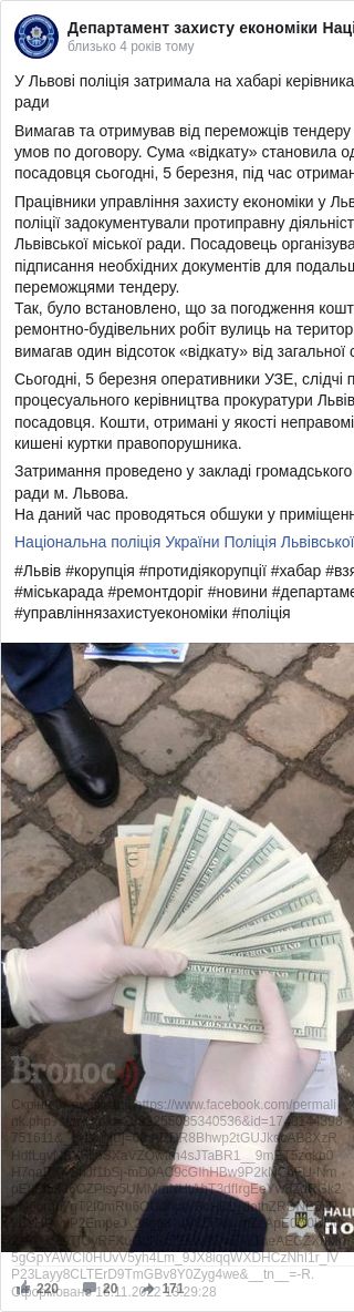 Під час отримання хабара у розмірі 8 тисяч гривень у вівторок, 5 березня, поліція затримала начальника управління фінансового контролю Львівської міськради Олега Дроздова.