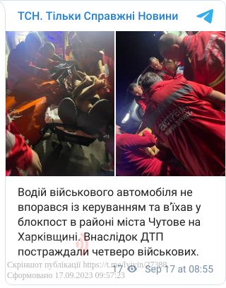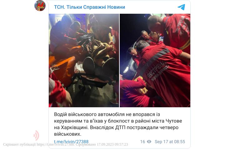 За даними центру, медики поверталися до Харкова після успішної евакуації. Дорогою їх зупинили на місці дорожньо-транспортної пригоди. Водій військового автомобіля не впорався із керуванням та в’їхав у блокпост в районі міста Чутове. Внаслідок ДТП постраждали четверо військових.