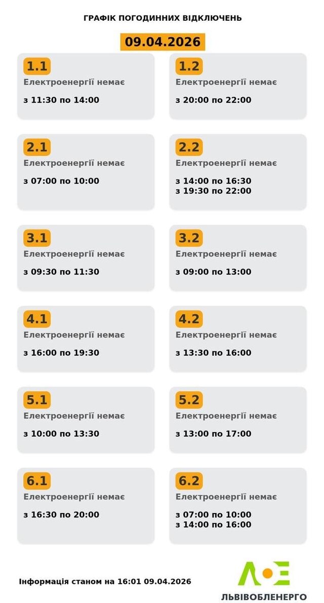 У четвер, 9 квітня, на Львівщині діятимуть графіки відключення світла.