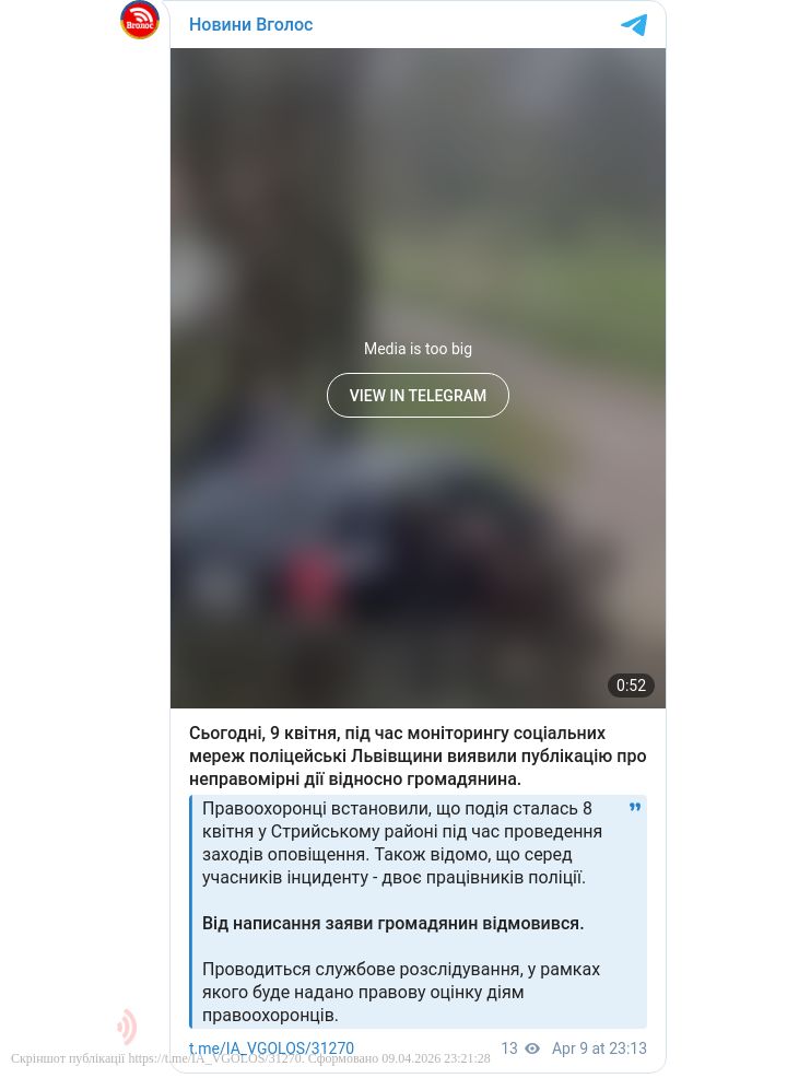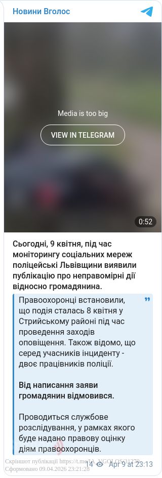 Сьогодні, 9 квітня, під час моніторингу соціальних мереж поліцейські Львівщини виявили публікацію про неправомірні дії відносно громадянина.