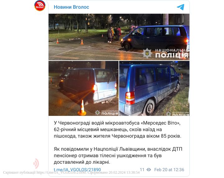 У Червонограді водій мікроавтобуса «Мерседес Віто», 62-річний місцевий мешканець, скоїв наїзд на пішохода, також жителя Червонограда віком 85 років.