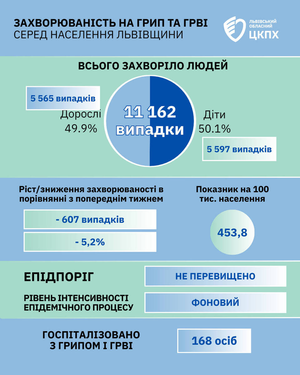 На Львівщині зафіксували суттєве зниження захворюваності на грип та гострі респіраторні вірусні інфекції, а кількість госпіталізацій за тиждень скоротилася на рекордні 47%.