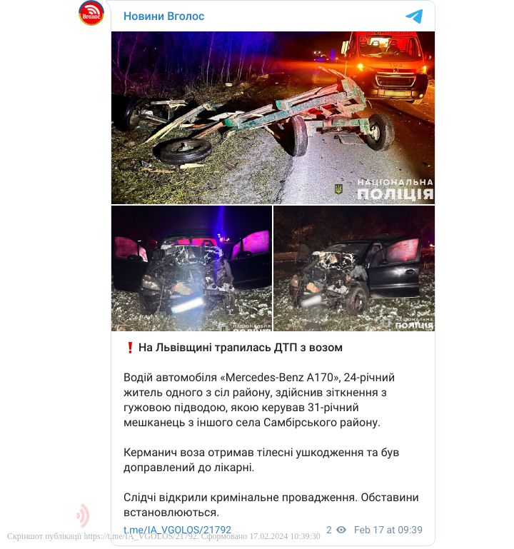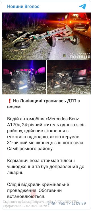 Водій автомобіля «Mercedes-Benz A170», 24-річний житель одного з сіл району, здійснив зіткнення з гужовою підводою, якою керував 31-річний мешканець з іншого села Самбірського району.