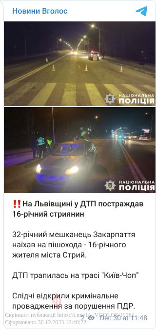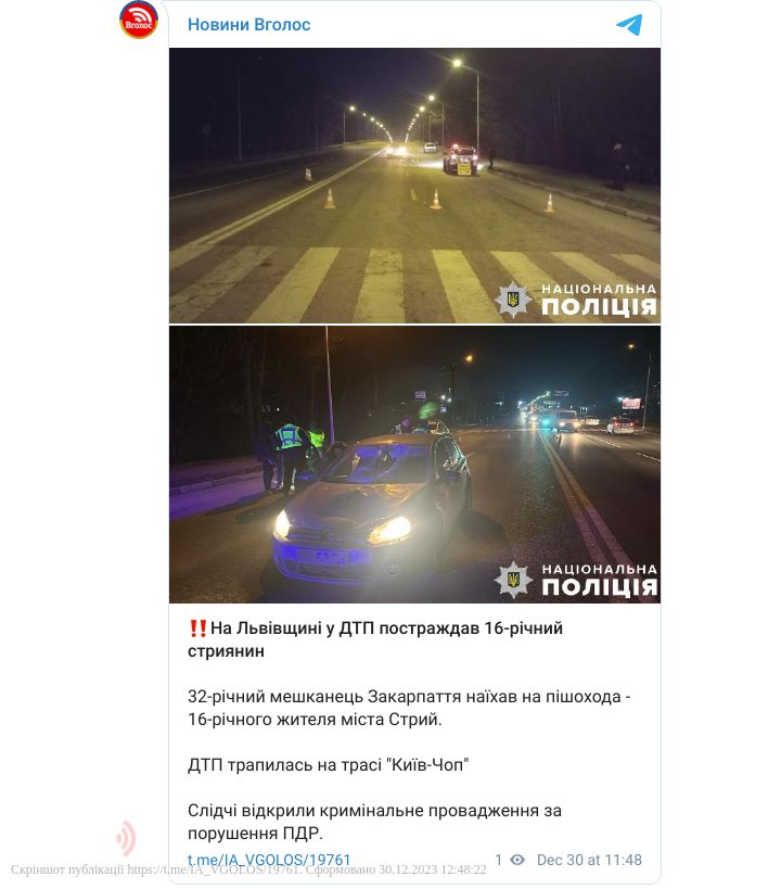 Водій автомобіля «Фольксваген Гольф», 32-річний мешканець міста Мукачево Закарпатської області, скоїв наїзд на пішохода – жителя міста Стрий віком 16 років.