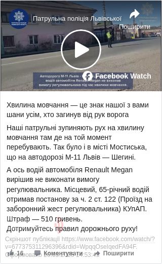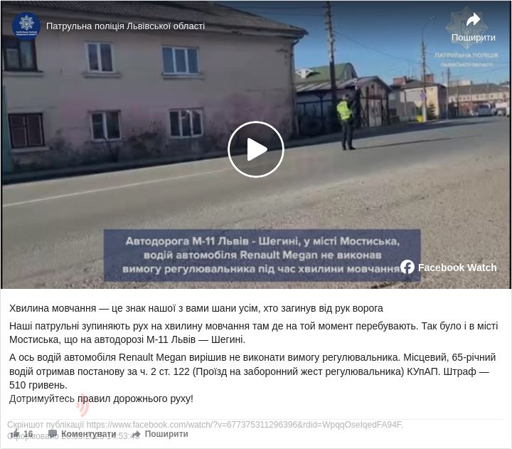У Мостиськах оштрафували 65-річного водія, який не зупинився під час загальнонаціональної хвилини мовчання.