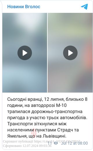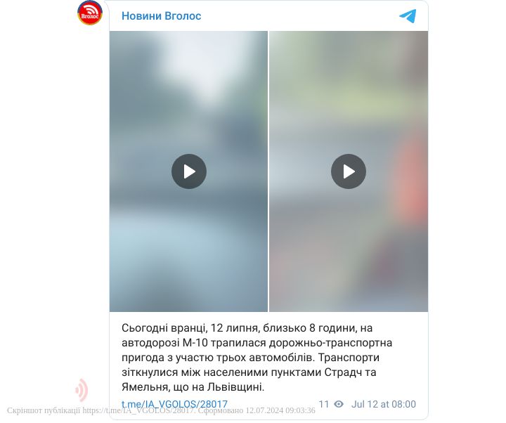 Сьогодні вранці, 12 липня, близько 8 години, на автодорозі М-10 трапилася дорожньо-транспортна пригода з участю трьох автомобілів.