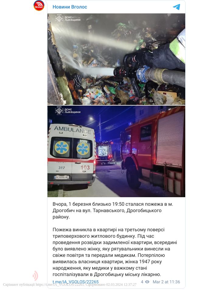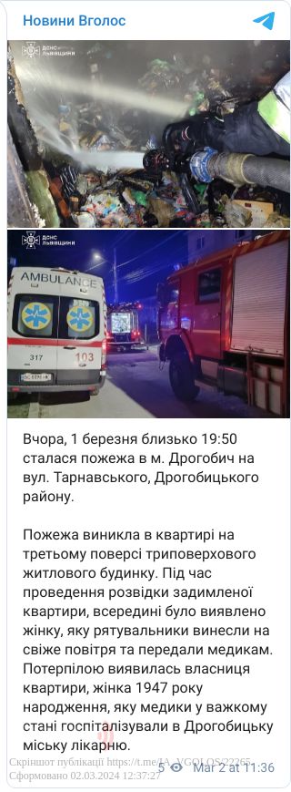 У п'ятницю, 1 березня, близько 19:50 сталася пожежа в Дрогобичі на вул. Тарнавського, Дрогобицького району.
