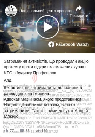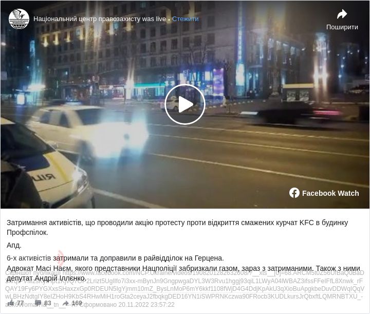 "Затримали за протест проти відкриття KFC в Будинку профспілок на річницю Майдану. Тут, між іншим гинули люди", - йдеться в повідомленні організації.