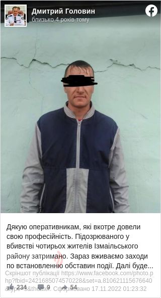 "Спасибі оперативникам, які вкотре довели свій професіоналізм. Підозрюваного в убивстві чотирьох жителів Ізмаїльського району затримано. Зараз вживаємо заходів для встановленню обставин події", – написав він.