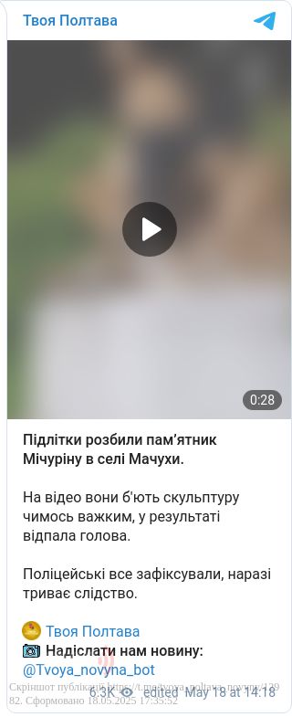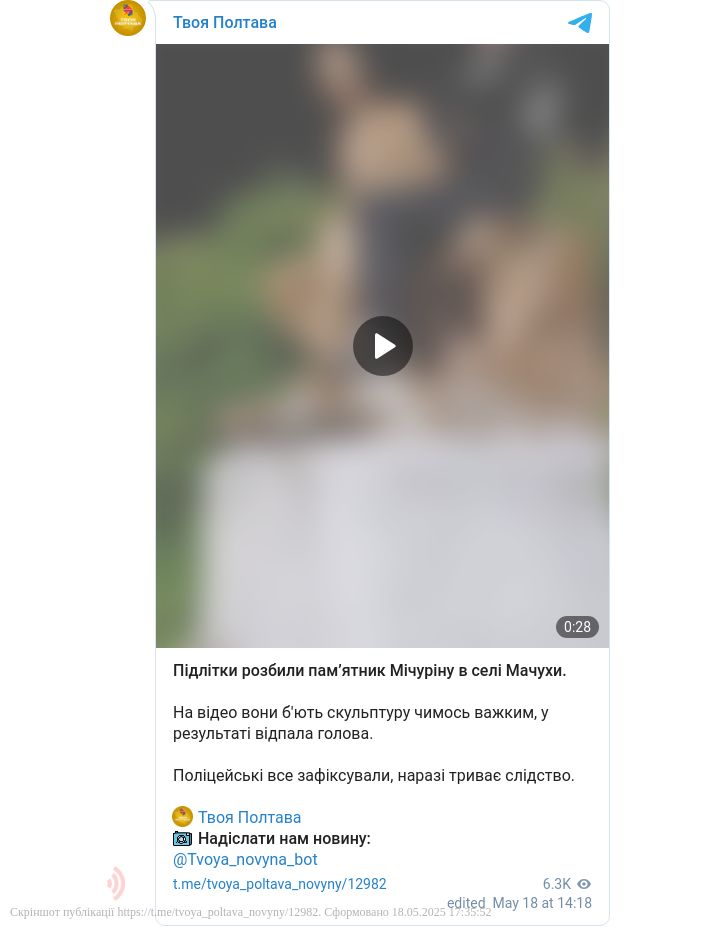 У селі Мачухи неподалік Полтави неповнолітні розбили пам'ятник російському комуністу та біологу Іванові Мічуріну.