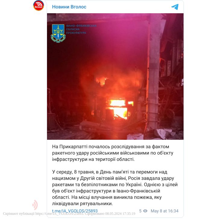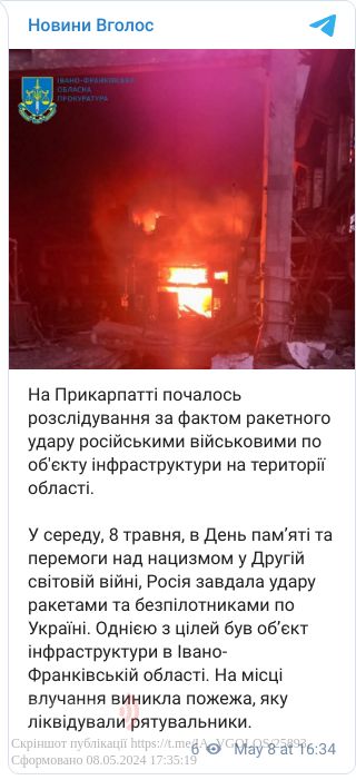 У середу, 8 травня, в День памʼяті та перемоги над нацизмом у Другій світовій війні, Росія завдала удару ракетами та безпілотниками по Україні. Однією з цілей був об’єкт інфраструктури в Івано-Франківській області. На місці влучання виникла пожежа, яку ліквідували рятувальники.
