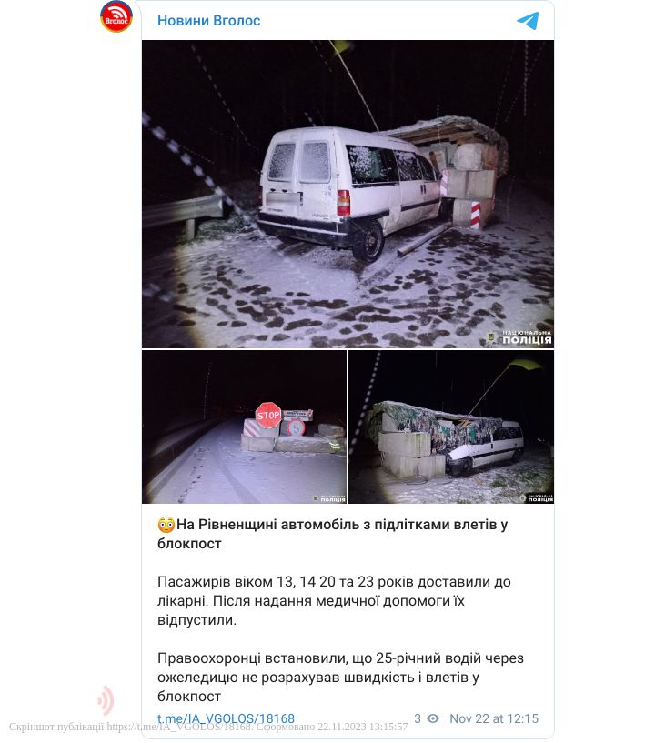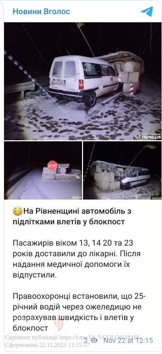 Слідчо-оперативна група на місці події з'ясувала, що 25-річний водій автомобіля «Citroën Jumpy», не врахував стан дорожнього покриття, не вибрав безпечної швидкості руху, проігнорував встановлені обмежувальні знаки та допустив наїзд на бетонні блоки блокпоста.
