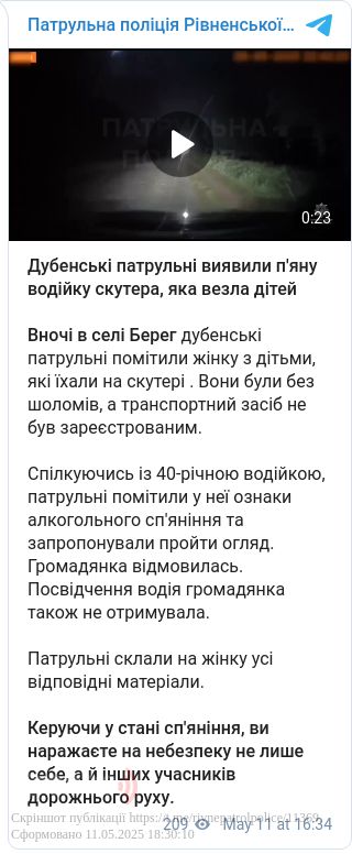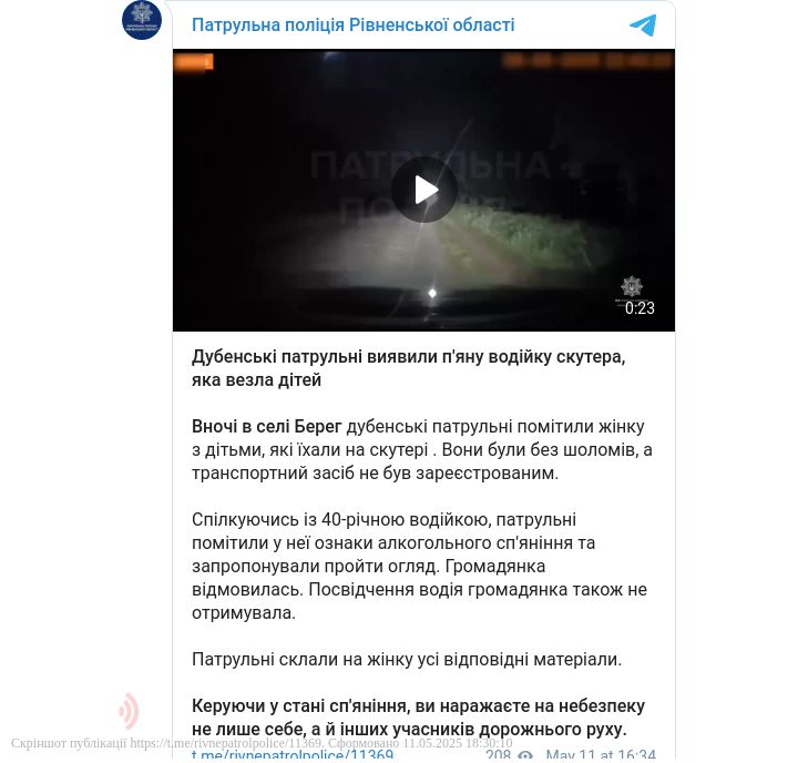 Вночі в селі Берег дубенські патрульні помітили жінку з дітьми, які їхали на скутері. Вони були без шоломів, а транспортний засіб не був зареєстрованим.