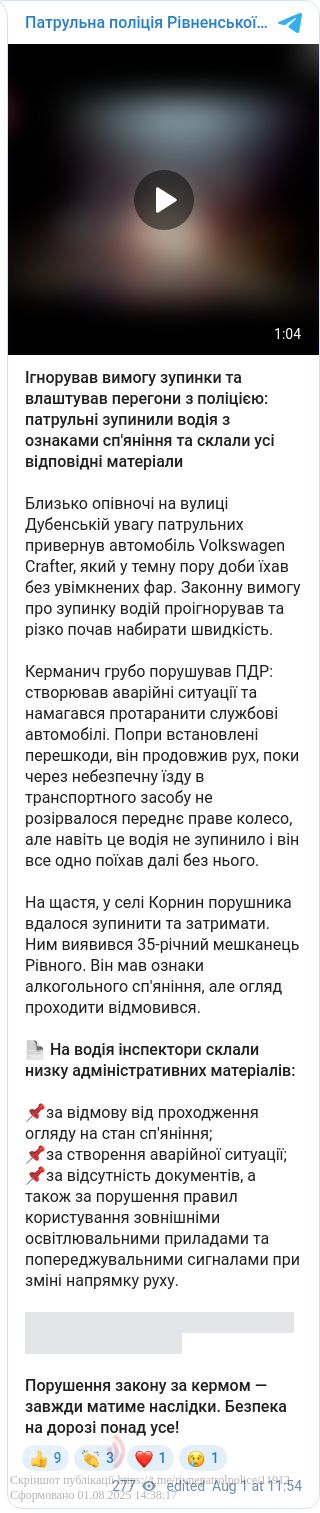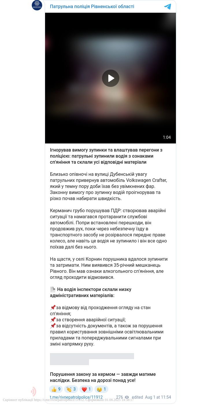 Як зазначається, близько опівночі на вулиці Дубенській увагу патрульних привернув автомобіль Volkswagen Crafter, який у темну пору доби їхав без увімкнених фар. Водій проігнорував законну вимогу зупинитися та різко прискорився.