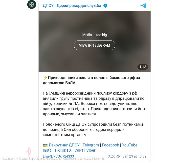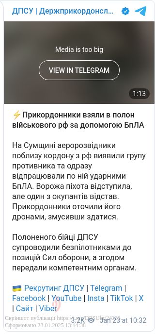 У Сумській області аеророзвідники Державної прикордонної служби України (ДПСУ) за допомогою безпілотників взяли у полон російського окупанта.