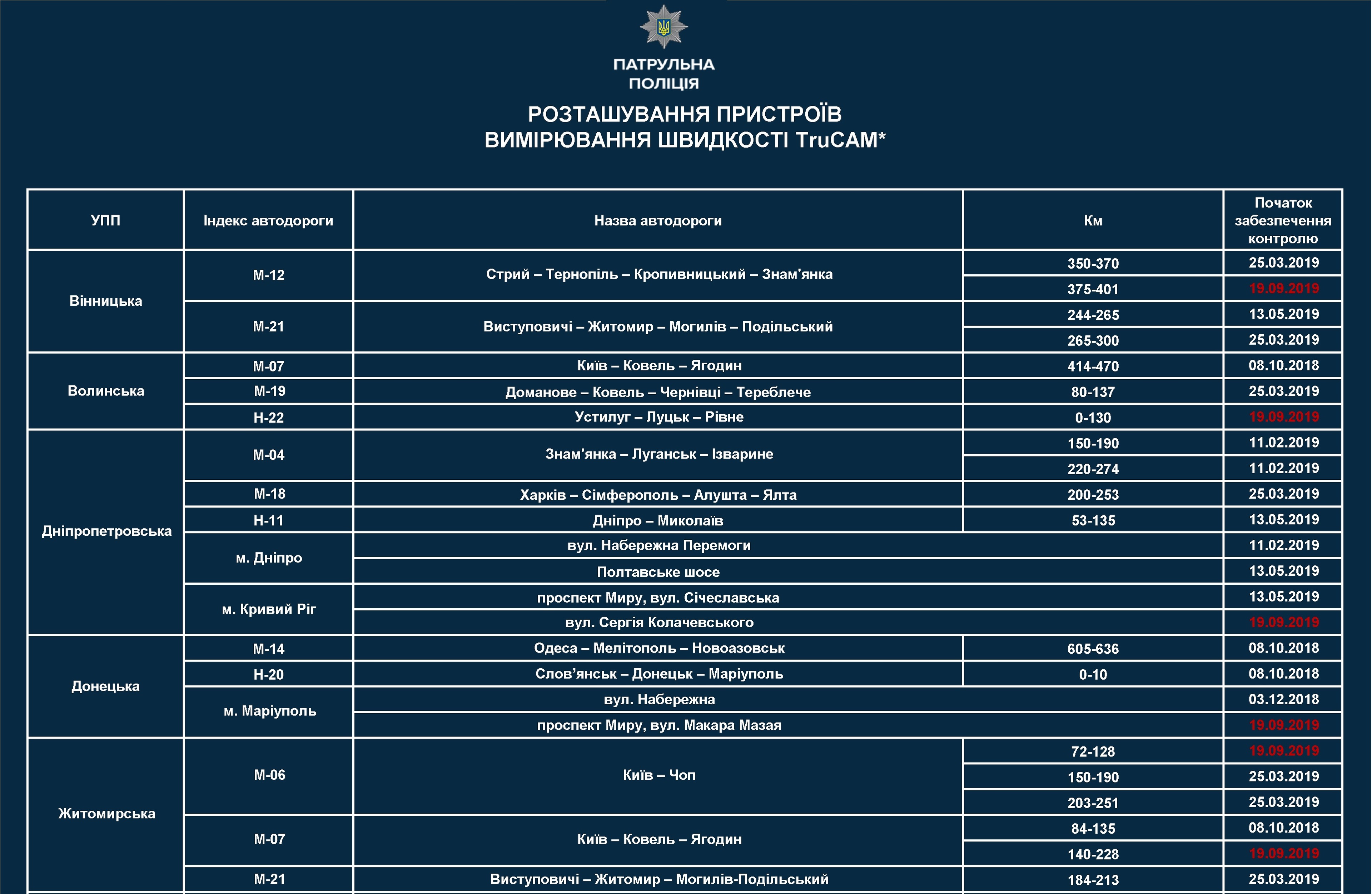 Від четверга, 19 вересня, на автомобільних дорогах України збільшується кількість радарів TruCam, які вимірюють швидкість руху.