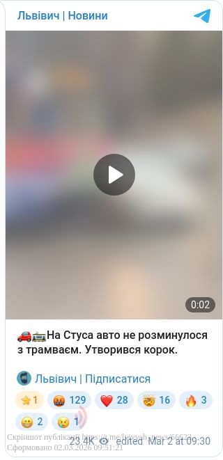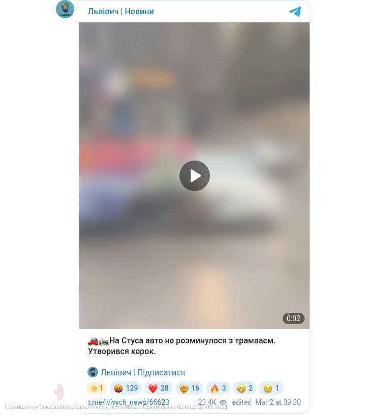 У понеділок, 2 березня, у Львові на вулиці Стуса сталася дорожньо-транспортна пригода за участі легкового автомобіля та трамвая. Інцидент значно ускладнив рух громадського та приватного транспорту на цій ділянці.