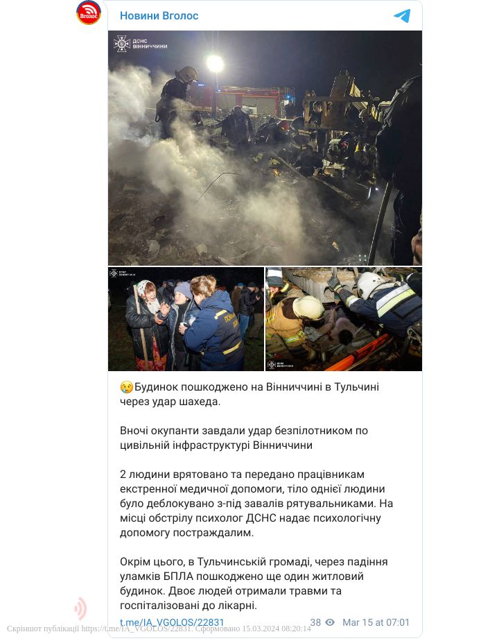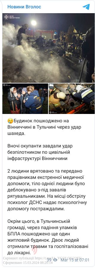 Окрім цього, в Тульчинській громаді, через падіння уламків БПЛА пошкоджено ще один житловий будинок. Двоє людей отримали травми та госпіталізовані до лікарні.