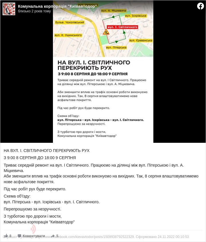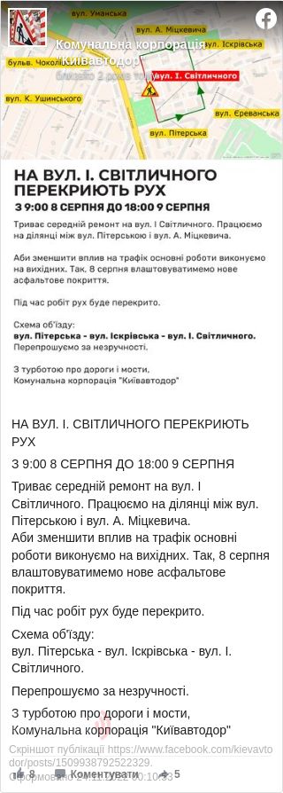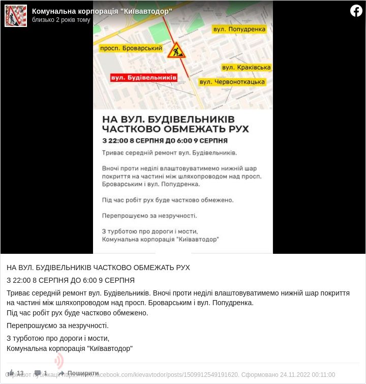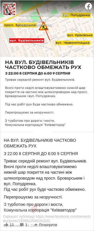 Про це повідомила у Facebook КК «Київавтодор».