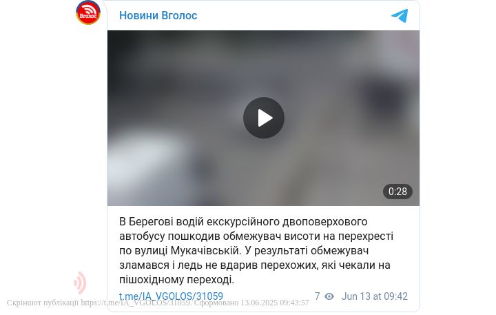 В Берегові водій екскурсійного двоповерхового автобусу пошкодив обмежувач висоти на перехресті по вулиці Мукачівській. У результаті обмежувач зламався і ледь не вдарив перехожих, які чекали на пішохідному переході.