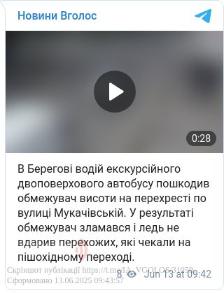Інцидент трапився 11 червня на перехресті вулиці Мукачівської та мосту через канал Верке у Берегові. Тут водій двоярусного екскурсійного автобуса порушив правила дорожнього руху, проїхавши ділянкою з обмеженням по висоті.