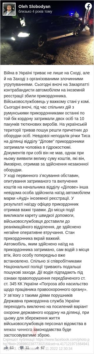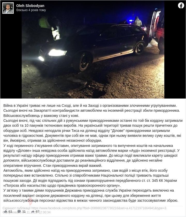 Слободян зазначає, що автівку, якою наїхали на прикордонника, затримали. Кермувальник цього авто втік, утім його особу вже встановили. ДПСУ та Нацполіція розшукують його.