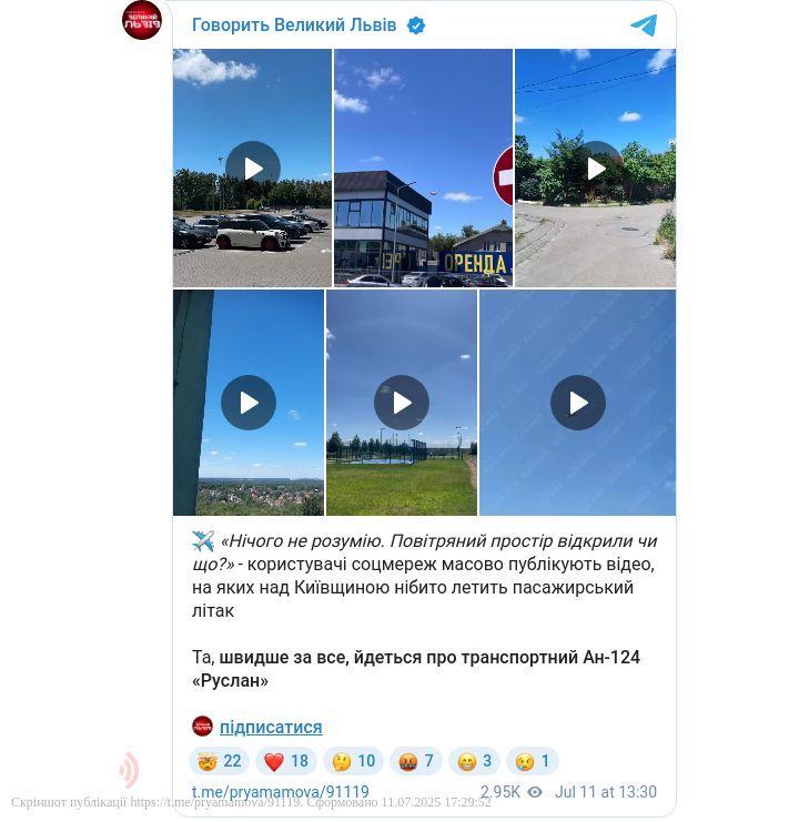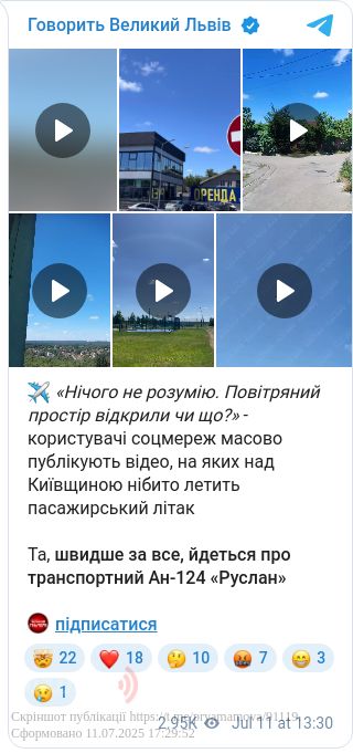 Сьогодні, 11 липня, у небі над Києвом помітили вантажний літак Ан-124 «Руслан».