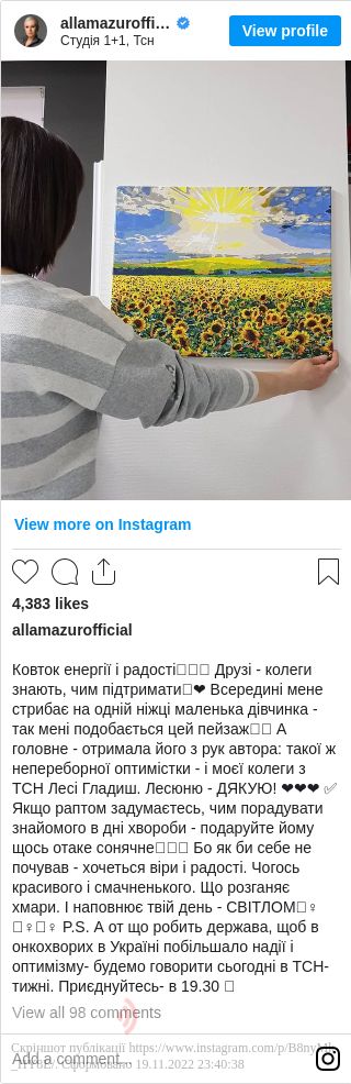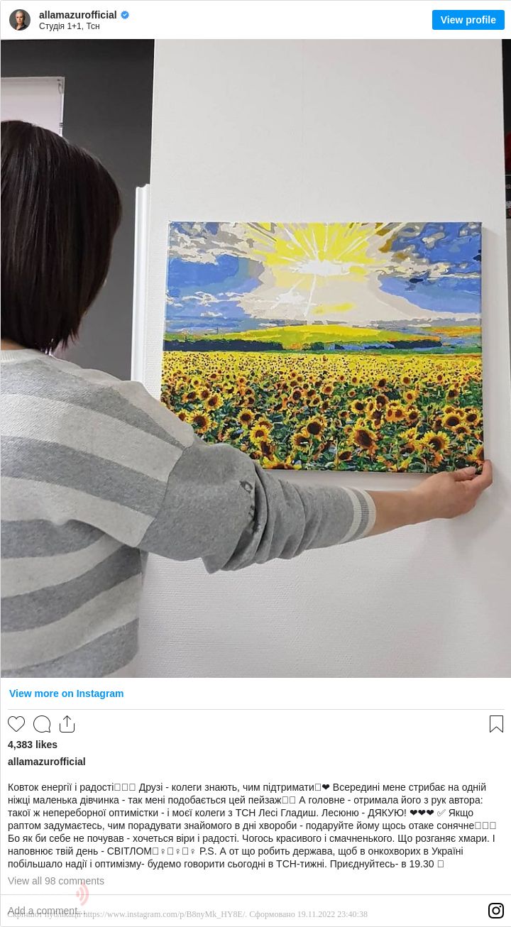 «Ковток енергії і радості. Друзі - колеги знають, чим підтримати. Всередині мене стрибає на одній ніжці маленька дівчинка - так мені подобається цей пейзаж. А головне - отримала його з рук автора: такої ж непереборної оптимістки - і моєї колеги з ТСН Лесі Гладиш. ДЯКУЮ!», - написала Алла Мазур.