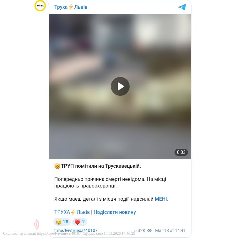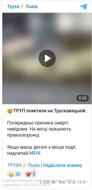 Сьогодні, 18 березня, на Трускавецькій було виявлено труп людини, причина смерті якої наразі залишається таємницею.