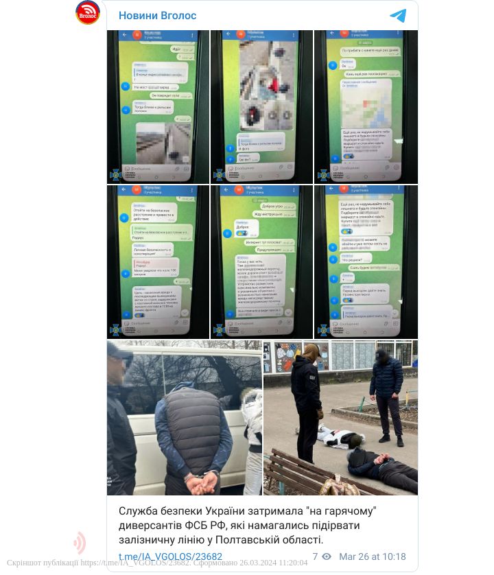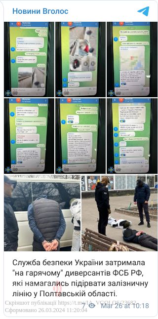 Служба безпеки України затримала диверсантів ФСБ РФ, які намагались підірвати залізничну лінію у Полтавській області.