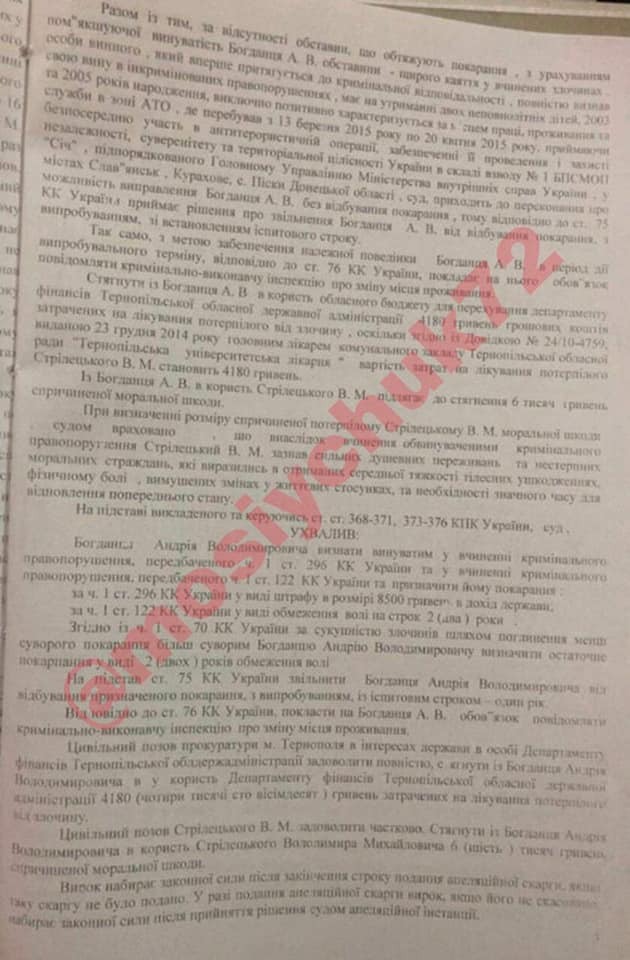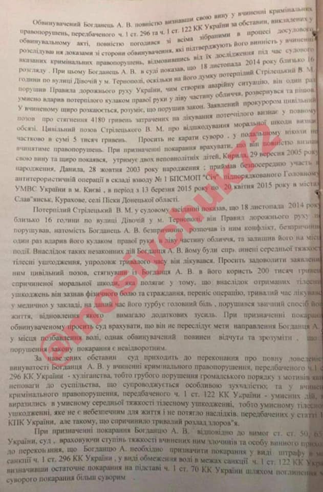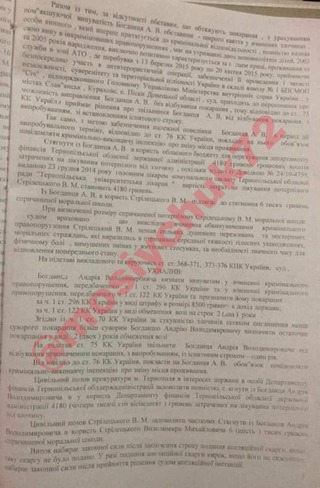 Також в документі зазначено, що Богданець просив пом'якшити вирок з огляду на те, що з 13 березня 2015 року до 20 квітня 2015 року він брав участь в АТО у складі батальйону «Січ» (суд врахував це прохання).