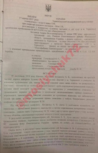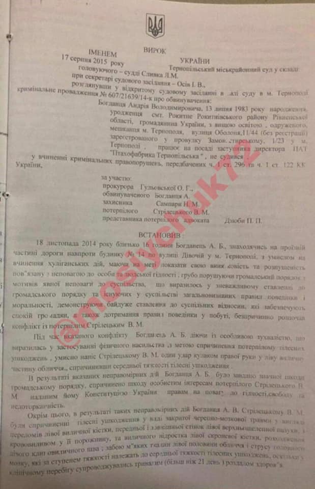 У вироку зазначено, що Андрій Богданець скоїв напад на чоловіка в Тернополі 18 листопада 2014 року.