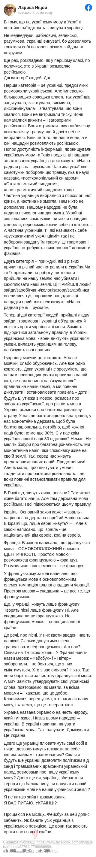 Громадська активістка та дитяча письменниця Лариса Ніцой написала відвертий та гострий пост про українську мову.