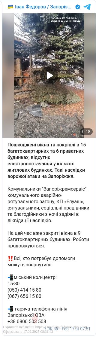 Російські окупанти у ніч на 17 лютого завдали чергового удару по Запоріжжю. Пошкоджено десятки будників. Частково відсутнє електропостачання.