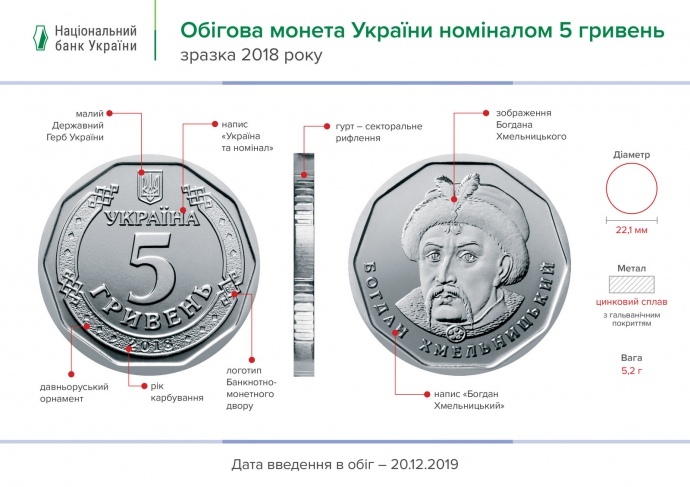 Згідно з даними регулятора, вага 5-гривневої монети – 5,2 грама. Діаметр на 2 мм більший, ніж копійки, номіналом 2 гривні.