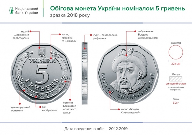 У п’ятницю, 20 грудня, Нацбанк ввів у обіг нові монети, номіналом п’ять гривень. Про це повідомляє пресслужба банку.