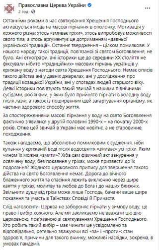 «Жодного церковного припису для звершення такого дійства на свято Богоявлення немає», – розповідають в ПЦУ.Водночас в ПЦУ наголосили, що не забороняють пірнати у холодну воду, але закликають не пов'язувати її з Водохрещем.