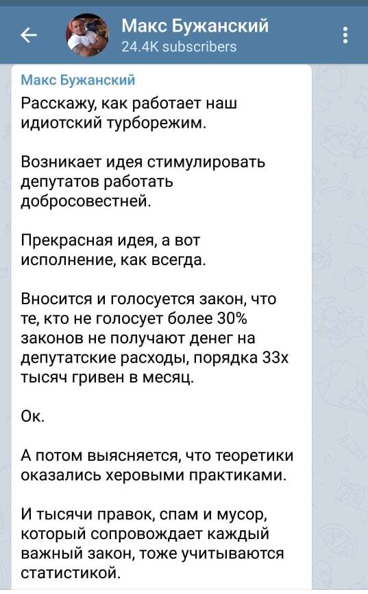 «Розповім, як працює наш ідіотський турборежим. Виникає ідея стимулювати депутатів працювати більш сумлінно. Прекрасна ідея, а от виконання, як завжди, - зазначив він. - Вносять і голосують за закон. Ті, хто НЕ голосує більш, ніж за 30% законів, НЕ отримують грошей на депутатські витрати, а це близько 33-х тисяч гривень в місяць».
