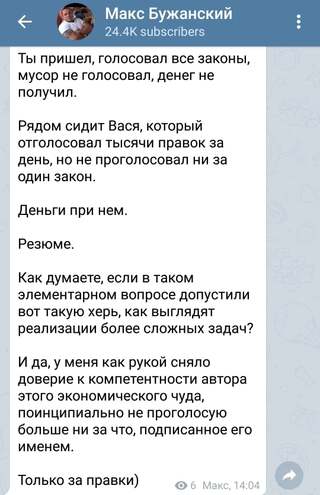 І зазначив: «Як думаєте, якщо в такому елементарному питанні допустили ось таку х***, як виглядає реалізація більш складних завдань? У мене зникла довіра до компетентності автора цього економічного дива, принципово не проголосую більше ні за що, підписане його ім'ям. Тільки за правки)».