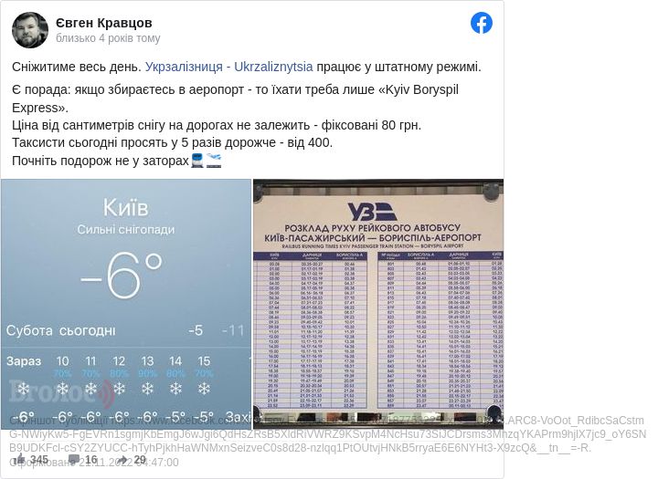 "Є порада: якщо збираєтесь в аеропорт — то їхати треба лише «Kyiv Boryspil Express». Ціна від сантиметрів снігу на дорогах не залежить — фіксовані 80 грн. Таксисти сьогодні просять у 5 разів дорожче — від 400. Почніть подорож не у заторах", — писав він.