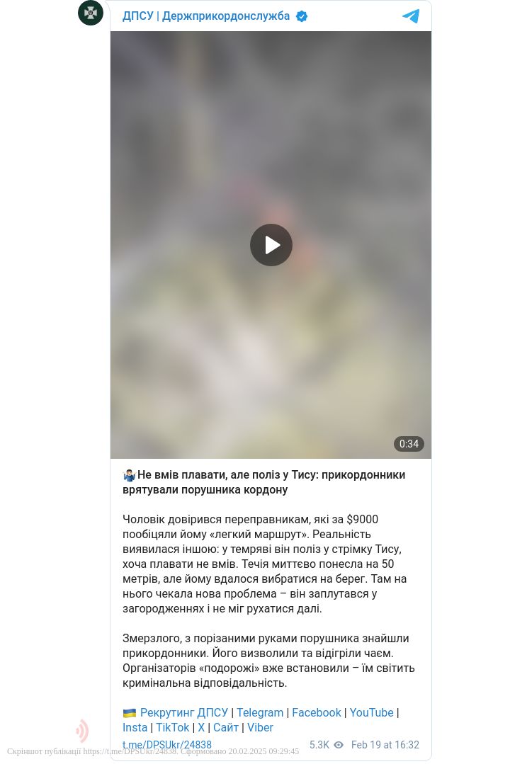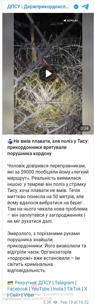 «Реальність виявилася іншою: у темряві він поліз у стрімку Тису, хоча плавати не вмів. Течія миттєво понесла на 50 метрів, але йому вдалося вибратися на берег. Там на нього чекала нова проблема – він заплутався у загородженнях і не міг рухатися далі», — йдеться в повідомленні.