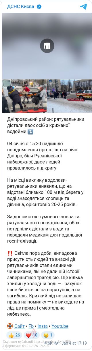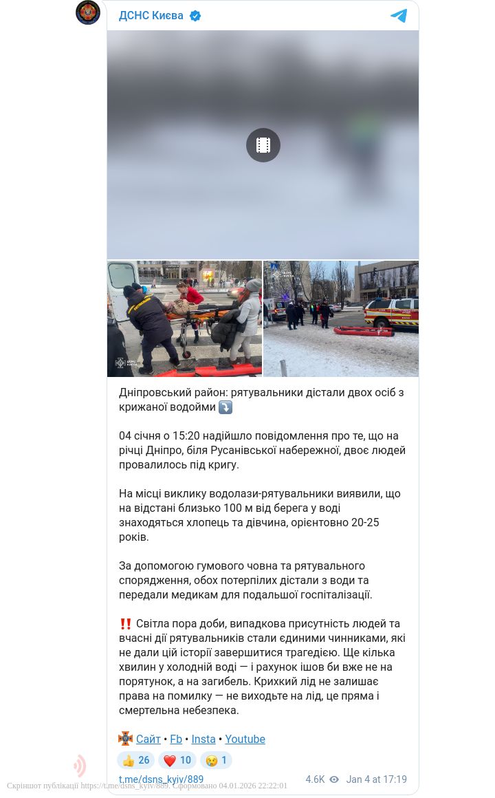 Як зазначається, 4 січня о 15:20 надійшло повідомлення про те, що на річці Дніпро, біля Русанівської набережної, двоє людей провалилось під кригу.