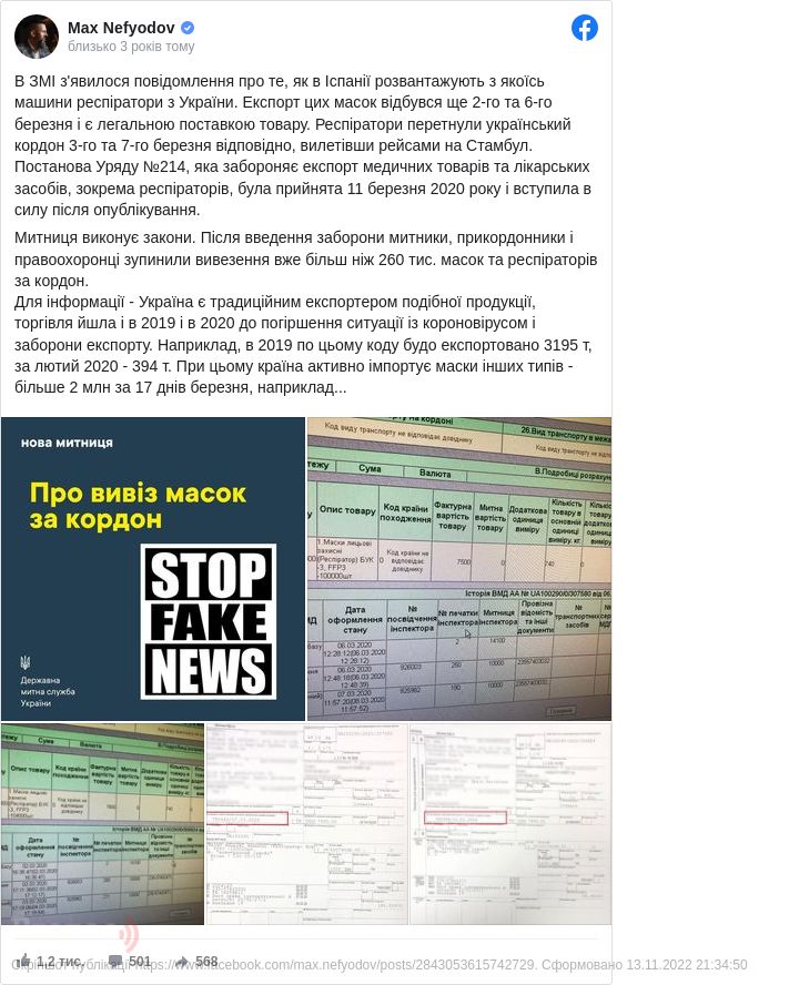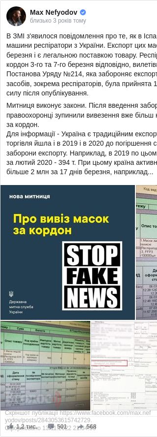 «В ЗМІ з'явилося повідомлення про те, як в Іспанії розвантажують з якоїсь машини респіратори з України. Експорт цих масок відбувся ще 2-го та 6-го березня і є легальною поставкою товару. Респіратори перетнули український кордон 3-го та 7-го березня відповідно, вилетівши рейсами на Стамбул. Постанова Уряду №214, яка забороняє експорт медичних товарів та лікарських засобів, зокрема респіраторів, була прийнята 11 березня 2020 року і вступила в силу після опублікування», - написав Нефьодов.